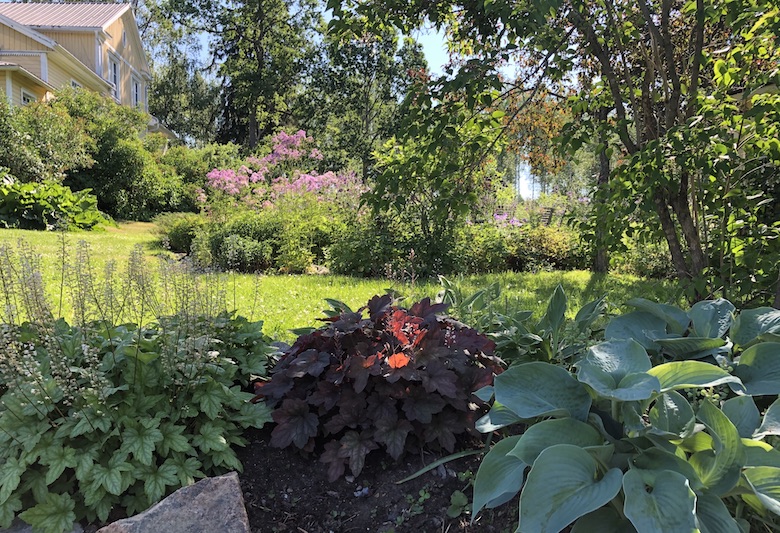 Toisesta suunnasta katsottuna. Yllä kuvan oikeassa laidassa näkyy pienenä pilvikirsikan taimi takana olevan koivun "edessä". Pilvikirsikoita on yhteensä kuusi ja eilen istutin pilvikirsikoiden lähistölle myös liuskalehtilehmuksen taimen. Laatikon reunassa kukkivat tuoksuherneet.